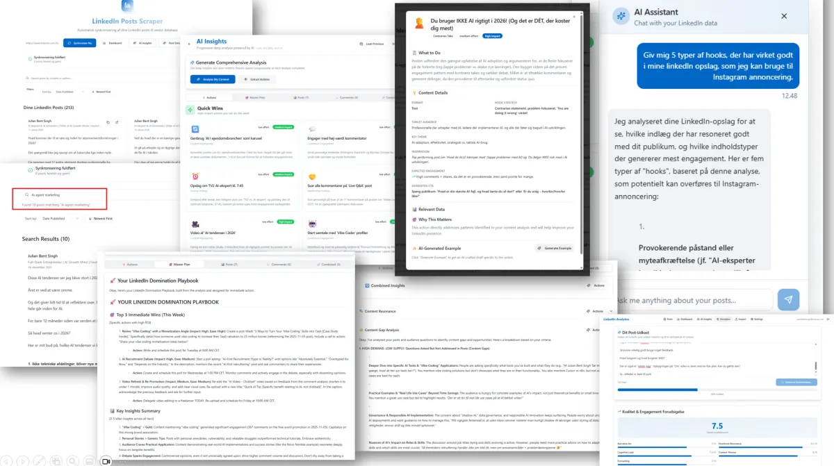 LinkedIn Content Hub samler dit LinkedIn-arbejde ét sted. Du kan søge i tidligere opslag, få AI-drevne indsigter i hvad der virker, og simulere hvordan nye opslag vil resonere med dit audience. Alt styres gennem én enkel chat, så du slipper for at navigere rundt i interfacet. Værktøjet er gratis, men du betaler selv for API til AI og hentning af LinkedIn-opslag.